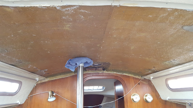 Sisällä vaihdetaan keulan seinämatot uusiin. Rapsuttelu on hidasta kun vanha matto ei tahdo irrota, mutta eiköhän lopputulos ole vaivan arvoinen :)